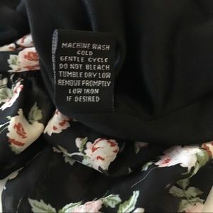New Look Mini Dress Black with flower designs, used, size Medium, half of the tag is not connected to the, dress V neck with ruffles , button down half way , garter in the middle of the dress, layered ruffles in the bottom on the dress,100% polyester, 10% of your purchase amount after Fees will be donated to charity