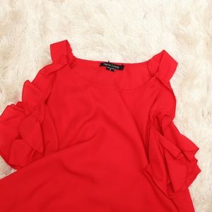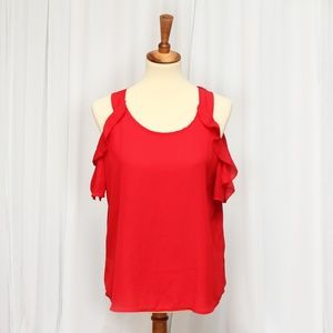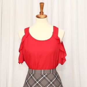 New Look Top Red Ruffle Cold Shoulder Top Size: small Material: 100% Polyester Excellent Pre-owned Condition