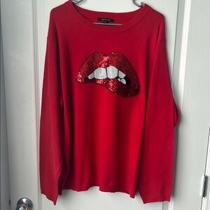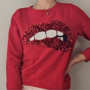 Vibrant red sweater with striking sequin lip motif. Perfect for making a statement.