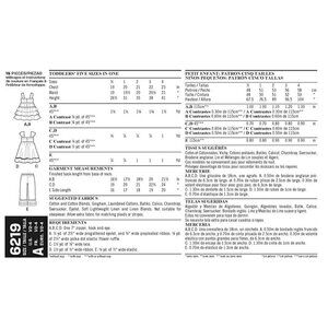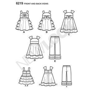 Toddlers' dress in two lengths with bow or flower embellishments on the bodice and pull on pants with three layers of ruffles at leg hems. Great for fabric mixing!