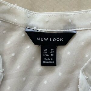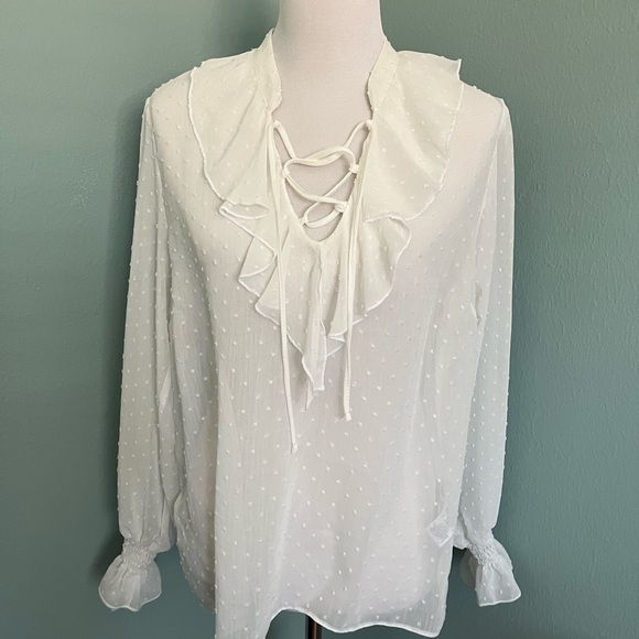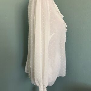 Sheer. 100% Polyester. Machine wash. Elastic at sleeves.