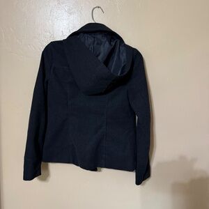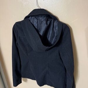 Resembles the Navy Peacoat. Has a hood. 40% Wool, however super warm. No flaws. ONE missing button………