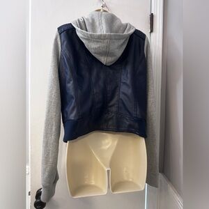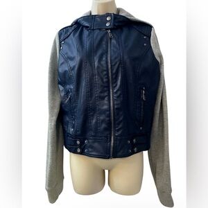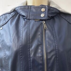New Look Women’s L Navy Faux Leather Moto Jacket with Gray Hood & Sleeves