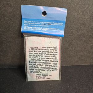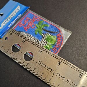 New in package vintage 1980s Los Angeles California souvenir travel patch. Embroidered sew-on patch measures approximately 2.75" long. Features palm trees and city hall on a blue background. Voyager brand.