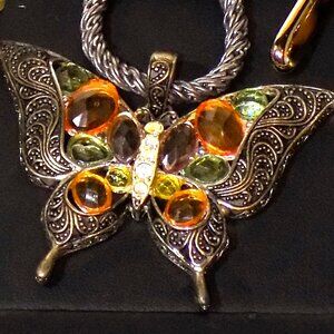 New w/$35.50 tag Jenny neutral drop chandelier with wood, tortoiseshell, goldtone beads & rhinestones. New w/$28 tag Inda chain & charm chandelier earrings are 3" long. Some of the brass-tone oval charms have patina on the finish, giving them an aged look. Rectangle earrings have real flowers under a layer of resin. Large 2-7/8" x 2-1/8" x 1/4" butterfly has Earthtone faceted gems & clear rhinestones with raised scrollwork along the wing edges. 17 + 3" multi-link rope chain is 5mm thick. The colors of each piece compliment one another.
