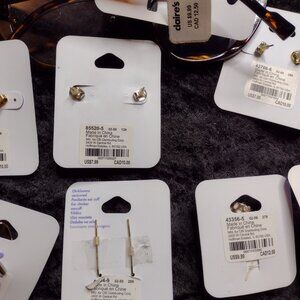 This lot includes 12 items from Claire's/Icing! Earrings, rings, ear cuff, ear crawler, fashion eye glasses, and an awesome necklace! MSRP of over $103.00 shown on the retail price tags!! Please note the gold medallion earrings have discoloration that is faint on the front and more noticeable on the back, other items may have retail shelf wear/markings on the tags and fashion glasses may have faint surface scratches, see pics. Buyer will receive the items shown in the photos. Please let me know if you have any questions!
