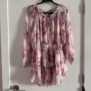 New LoveShackFancy Popover Mini Dress Pink Floral Layered Smocked Ruffled Sz L