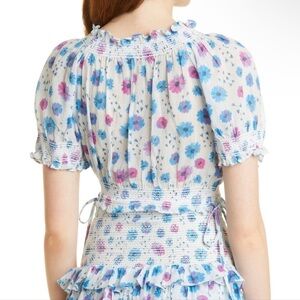 This LSF top is absolutely stunning!!! It’s made of 100% cotton and is light and has a smock waist detail - for the most flattering fit!! It’s beautiful and feminine purple and blue floral hues scream summer!!! This top sold out instantly!!! This is brand new with tags and has never been worn!! Don’t miss out on the perfect summer top to dress up or down and or with jeans or a cute skirt!!