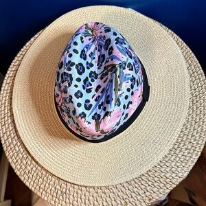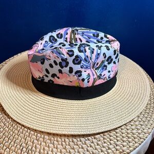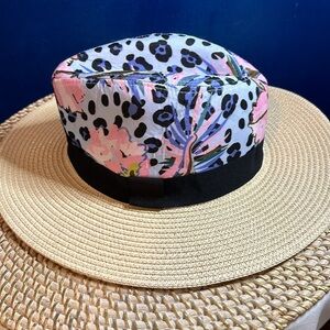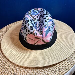 New Lucky 7 Blue & Pink Floral Animal Print Black Ribbon Wide Brim Sun Hat