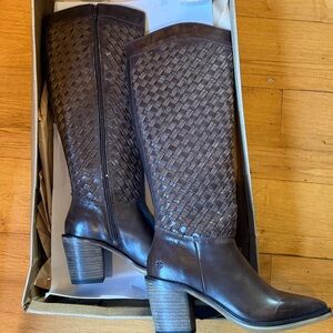 Stylish brown knee-high boots with a woven leather design. Perfect for a chic look. Does recommend sizing down.