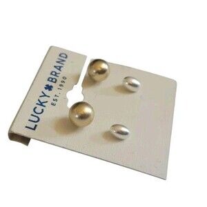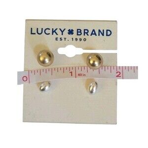 A Classic set of Lucky Brand silver and gold tone stud earrings with a modern matte finish. The earrings feature round and oval shapes in a classic fashion style. Made of metal, the earrings are designed for the earlobe with a stud closure. The item length is not specified but can be seen in the photos provided. Perfect for adding a touch of elegance to any outfit, these earrings are a versatile and stylish accessory for any occasion.