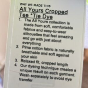 New! Lululemon SZ 12, tie die all yours cropped tee. Has a small washable spot on shoulder as seen in last pic , otherwise never used .
