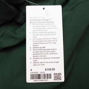 New Lululemon Size 4 Align Short Sleeve Dress 3" Liner Nulu LGYG Legacy Green