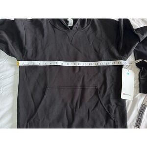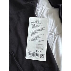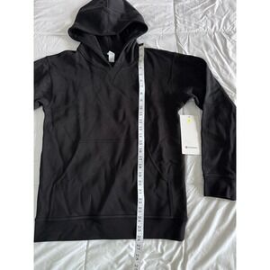 The product is a new Lululemon Size 6 All Yours Hoodie in black, made of cotton terry fabric. It is a relaxed fit hoodie with a crew neck and pullover closure. It features a hood, logo accents, and pockets including a kangaroo pocket and hidden pocket. This versatile hoodie is suitable for travel, activewear, and casual occasions, and is machine washable. Perfect for fall, winter, and spring seasons, this hoodie is ideal for outdoor activities like gym training, walking, yoga, pilates, and running.