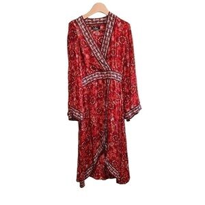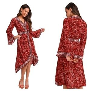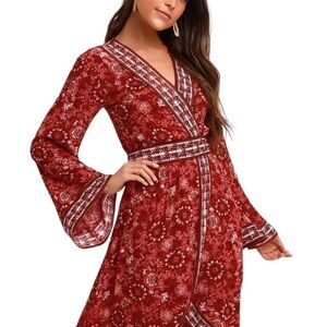 New Lulus Daydream Red Floral Print Bell Sleeve Dress, New with out Tags