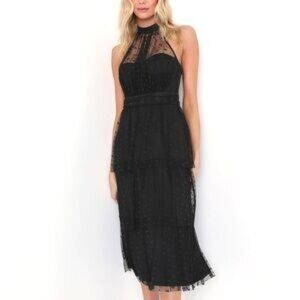 New Lulus Positively Precious Black Floral Mesh Tiered Halter Midi Dress P2475