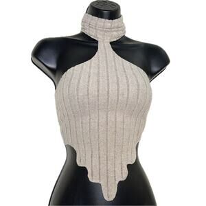 New medium Khaki Gray Beige Sleeveless Turtleneck Ribbed Drip Hem Crop Triangle