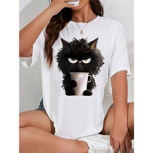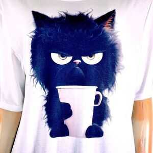 New M (L-XL)Oversized White Angry Black Cat Drinking Coffee Short Sleeve T Shirt