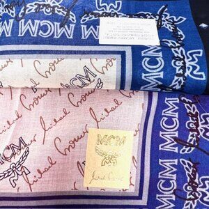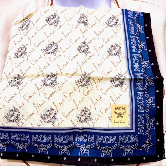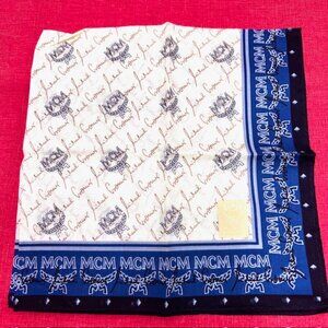 #99 New with sticker-MCM for men or women Handkerchief/ mini scarf cotton 19.5" , color blue beige , logo printed all over, made in Japan
