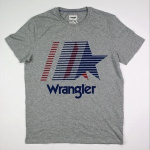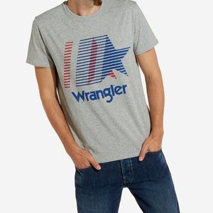This All-American style t-shirt in grey features the Wrangler Logo and a star-in-motion graphic.