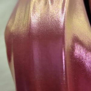 Materials Metalic ombre pink to yellow fabric, black satin lining, flexible interior for form