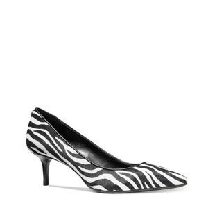 Give into your craving for the exotic with these fabulous MICHAEL Michael Kors kitten-heel flex pumps boasting a pointed toe in zebra-print calf hair.