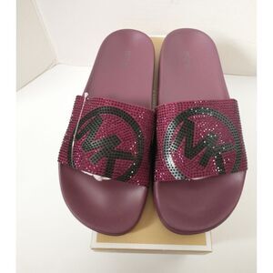 New! MICHAEL KORS Studded MK Logo Gilmore Slide Sandals Shoes Dark Berry