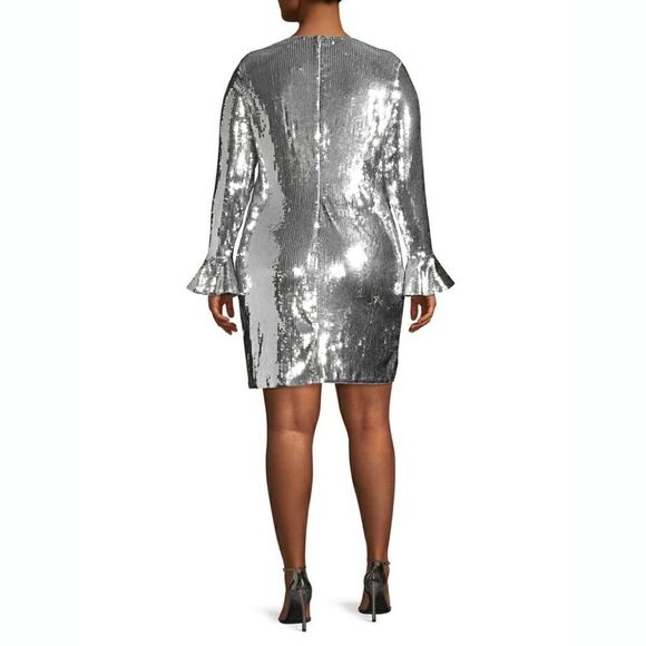 Shimmering sequins create a bold, mirror-like effect for MICHAEL Michael Kors' plus size dress. Flared sleeves add fresh flounce to the figure-fitting silhouette, too.