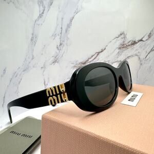 MIU MIU Sunglasses Women Black Acetate Slim Oval Gold Metal Logo Authentic Italy