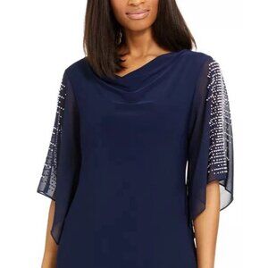 MSK Womens Matte Jersey Beaded Sheath Dress Size Large Color: navy blue New with tags from a smoke free home. The drama is in the sleeves on this gorgeous sheath dress from MSK, designed with split 3/4-sleeves that sparkle with bead embellishments. Features Approx. 37” long from center back neck to hem. Cowlneck; Sheath silhouette Pullover styling Split 3/4-sleeves with bead embellishments Unlined Shell: polyester/spandex; sleeves: polyester Hand wash Made in USA of imported materials Cocktail, wedding guest, semi formal, dinner, party, mother of the bride groom, bridal party, graduation, rehearsal dinner, lightweight, comfortable, stretchy