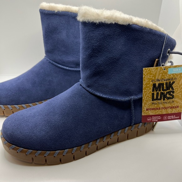 New MUK LUKS Water Repellent Suede Boots Twilight Blue Women's Size 6 NWT. Brand new, never worn, and original tags still attached. Comes from a smoke free environment. **See last photo for tiny spot on lower boot**