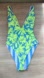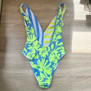 New Maaji Bluebell Stripe Kristi One Piece Plunge Stripe Swim Reversible Green Blue Small