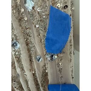 Experience the allure of this stunning Mac Duggal creation, a pink sequined gown featuring delicate spaghetti straps and a plunging V-neck. The tulle skirt adds a touch of whimsy, making it perfect for formal occasions. Despite being new, please note the presence of missing beads as indicated by blue tape in photos.