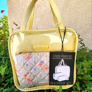 This Madden Girl cosmetic bag set features a vibrant yellow and cream color scheme, highlighted by a charming floral pattern. The set includes a transparent outer bag with yellow trim, offering a modern and practical design. Perfect for organizing your beauty essentials with style and flair.