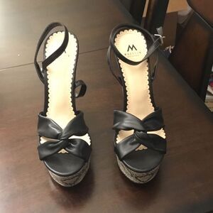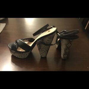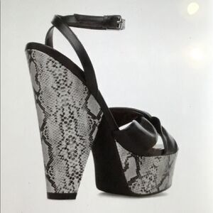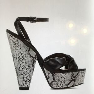 These platforms get an exotic boost from its reptilian finish. They feature a knotted vamp and modern black heel. They have a heel height of 4.25” with a 2” front platform height. They are brand new and never worn. They are size 8.