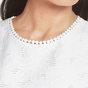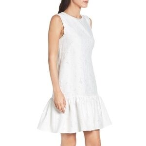 Bright and summery in white floral lace, this versatile shift is updated for a new season with a back cutout and a fluttery ruffled hem.