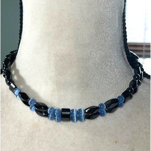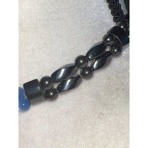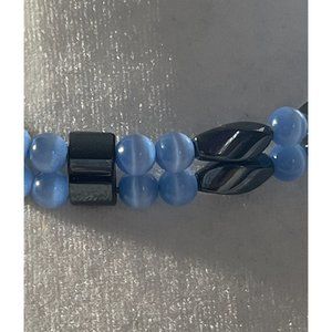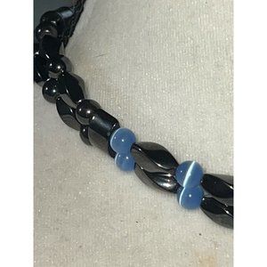 New Magnetic Black Metal And Cat Eye Necklace -- 16". This necklace was purchased from Old Dead Stock Inventory. Brand new black metal, blue cat-eye, and turquoise beads. This necklace is meant to be worn close to the neck and has a strong magnetic closure. Measurements: Length: 16"; Height: 1".