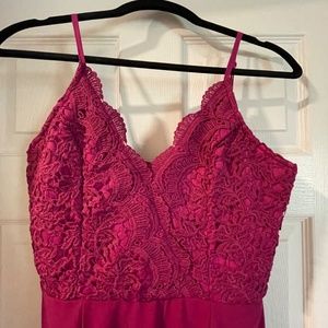 This dress is so gorgeous, I just never got a chance to wear it. New with tag still attached. Size medium. A deep but vibrant magenta color. Beautiful embroidery like lace on top. Adjustable straps. A nice leg slit on the front side.
