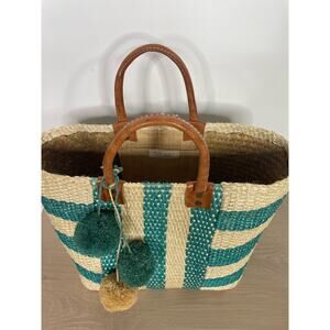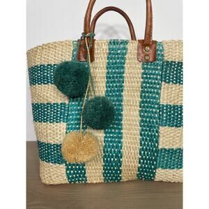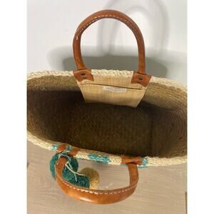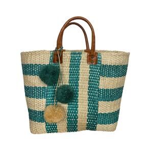 The bag is handmade with Sisal/sea grass and leather trim. It has one interior pocket and removable pom poms. It measures 13″W x 11 ½”H x 7″D. The material is firm enough for this to also work as a storage basket in your home.