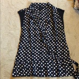Brand new, never worn, no tags. Vintage Marc Jacobs polka dot 100% silk blouse. Sleeveless with subtle frayed cap sleeves, plunging cross over neckline that ties at side. Pleated bottom hem with ruffle peplum bottom. Mini cap sleeve shoulder sleeve accent. Accented attached tie. Super fun vintage pinup secretary 50's / 60's style. Plunging neckline is sexy but cut and print otherwise demure. Beautiful piece from the 2000s. Size 4. Box BB.