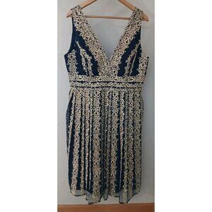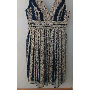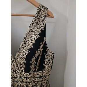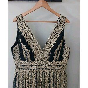 New Marchesa Notte Filigree Embroidered Tulle Dress. Size 16. Black with gold embroidery. Sleeveless. V neck. Evening, black tie, formal, New Year's Eve. New with tags. No flaws noted. Measures approximately 42" shoulder to hem, 19" pit to pit, 16" at waist.