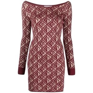 Make a statement in this stunning Marine Serre mini dress, crafted from a luxe wool-viscose blend. Featuring the signature Moon Diamond jacquard pattern—a nod to the brand’s iconic crescent moon motif—this dress hugs the body in a close silhouette with a sophisticated boat neckline. Perfect for fall layering or worn solo for an elevated evening look.