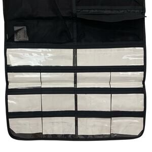 Black with clear plastic slots. Has snaps at the top so that it can hang from a bar or hander. Can be used for makeup or jewelry. Folds up making it great for travel.