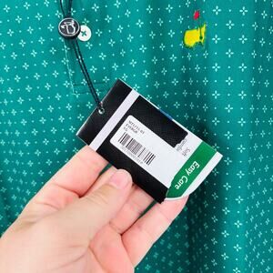 The New Master’s Augusta National Print Button-Up Shirt in size Large features a nice pattern with a Masters theme, making it perfect for casual occasions. This short sleeve shirt has a collared neckline and a button closure, providing a comfortable and stylish fit for men. Made from a blend of polyester and spandex, this shirt in green color offers a regular fit for a relaxed and fashionable look.
