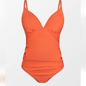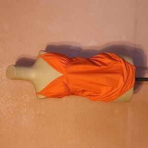 This is an orangish colored maternity one piece swimsuit, size large. It has triangle cups with removable pads. The spaghetti straps are adjustable. The back looks to be a little cheeky. NEW WITH TAGS!