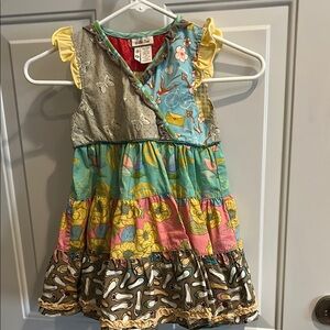 Vibrant dress with floral patterns. Features a mix of colors and playful design. Perfect for any occasion.