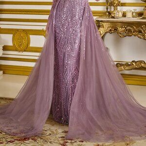 New Mauve Sheath Mother Of Bride Beaded Gown w/ Overskirt & Long Sleeves GL3832