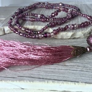 New Mauve silver lined seed bead and swarovski crystal necklace withg satin 4.5 inch tassel.