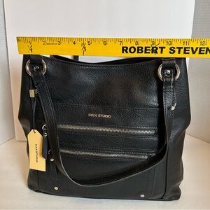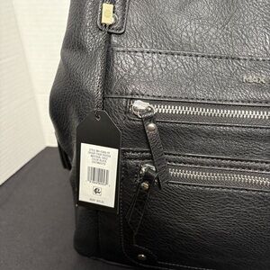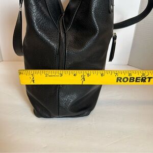 This bag has multiple zippered sections for organizing black lining silver strap holders silver zippers, beautiful sturdy bag for travel