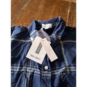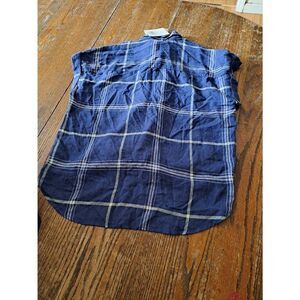 New With Tags Attached Women's Size Medium True Craft Short Sleeve Tie Waist Button Linen and Lyocell Blue and White Shirt Top Blouse with Cuffed Arm Hem, Pocket, and Collar